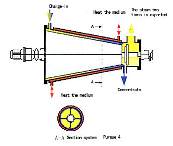 物料從大直徑端連續不斷地進入臥式蒸發器,被刮膜片加速和分配并立即在加熱面上形成一個薄的流動膜。